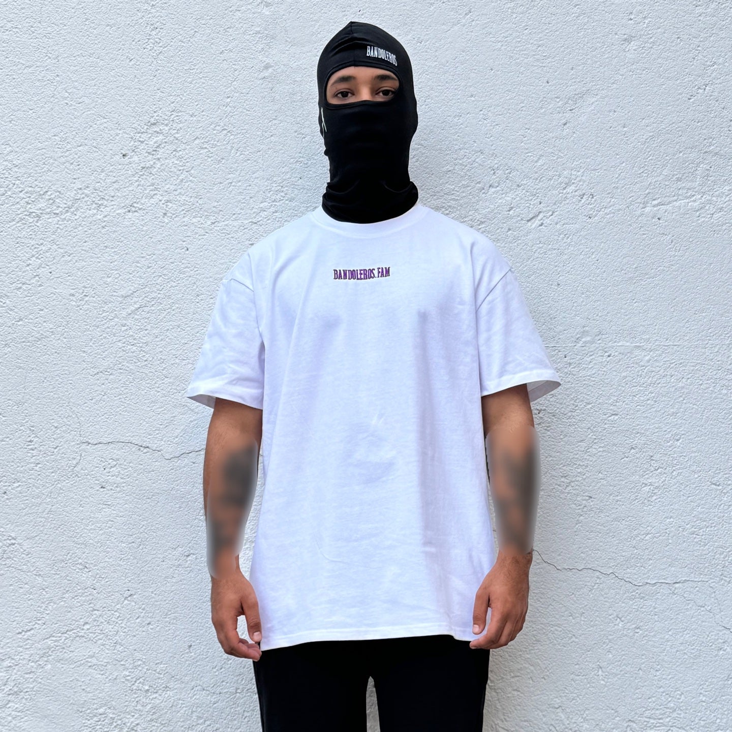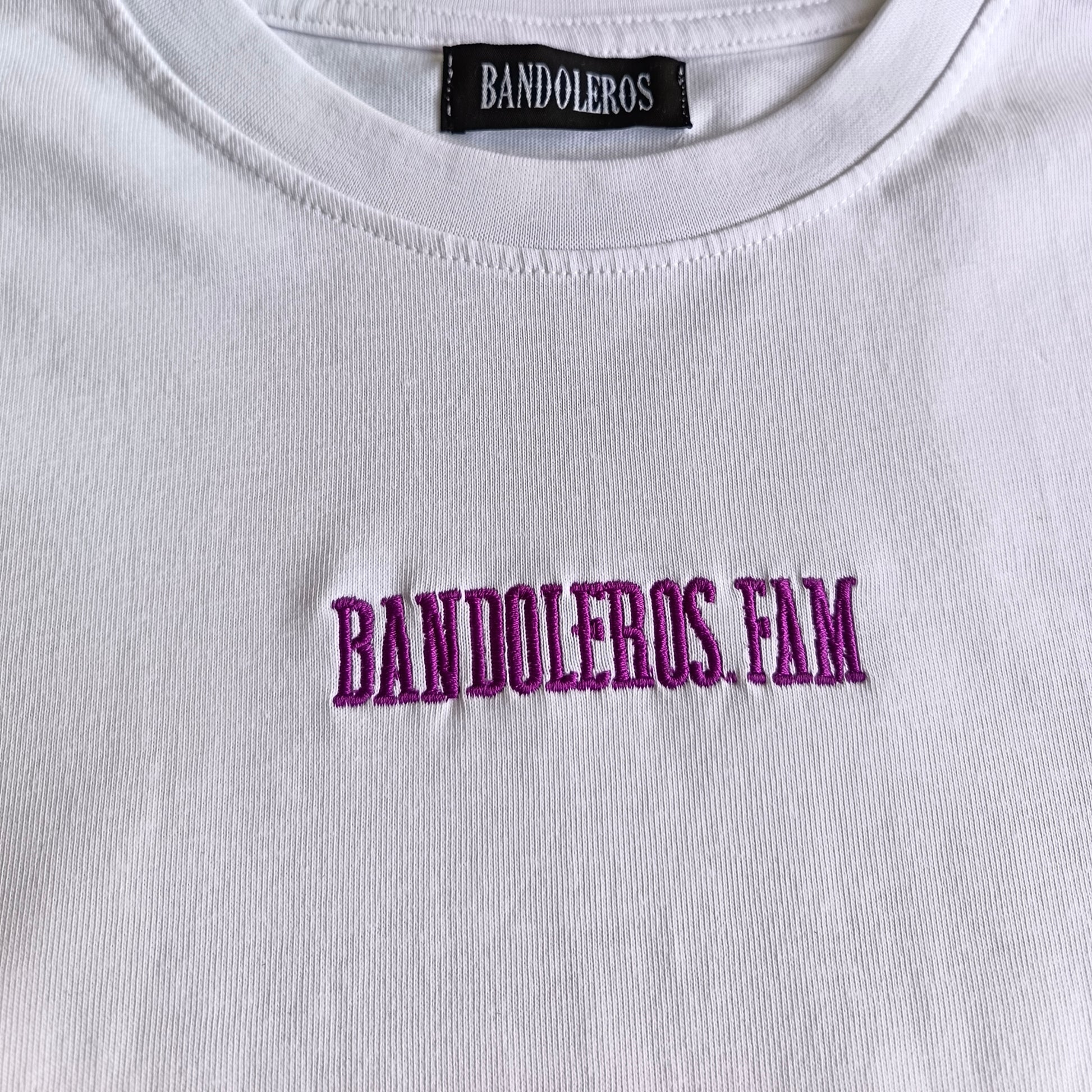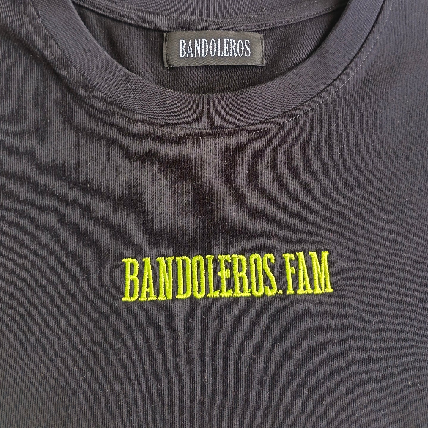 Camiseta con print en la espalda y "bandoleros.fam" bordado en el centro del pecho, de corte oversize.